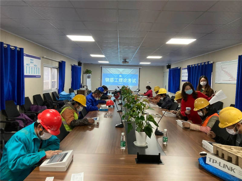 理論考試在百酈華庭項(xiàng)目部會(huì)議室進(jìn)行,由無(wú)錫市鑒定中心提供的移動(dòng)式平板電腦上完成考試。
