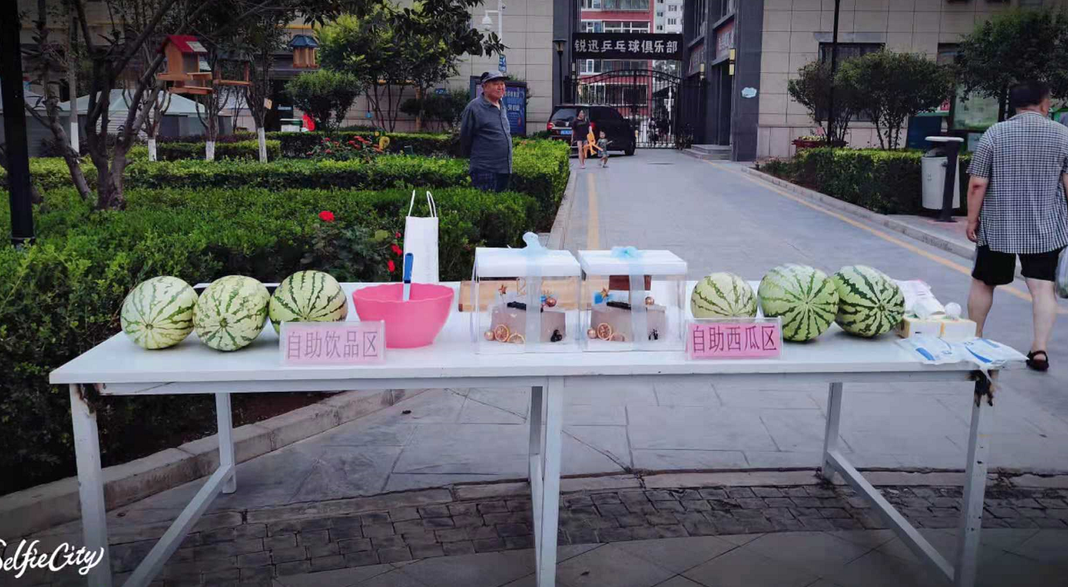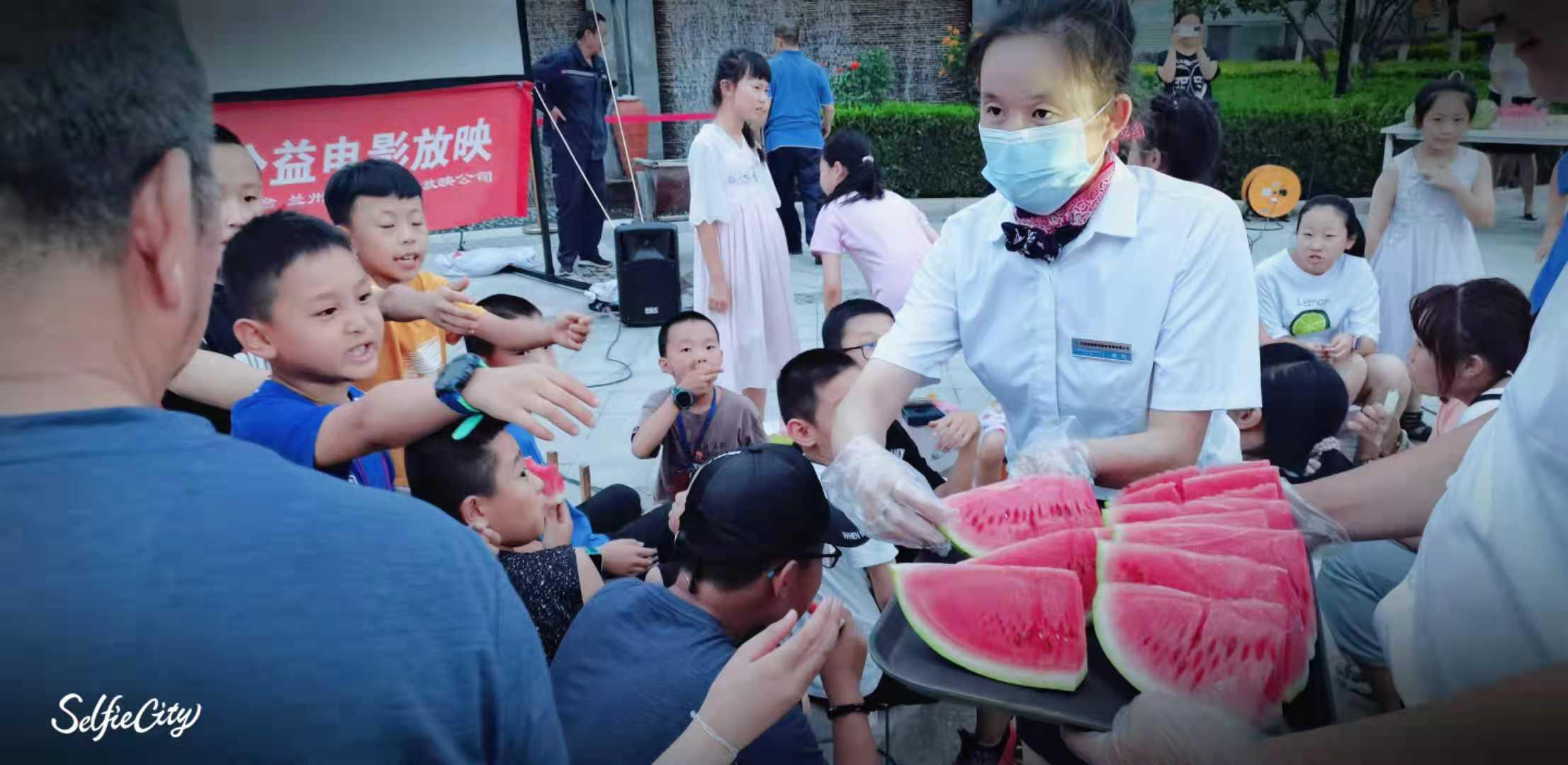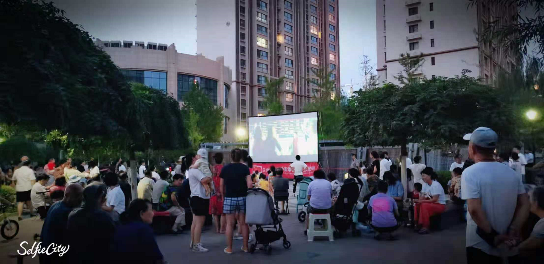 一塊幕布、一個投影儀,當(dāng)酷夏的夜晚被露天電影的屏幕點亮?xí)r,業(yè)主們紛紛進(jìn)入觀影場地,物業(yè)工作人員隨即將切好的西瓜、蛋糕以及精心熬制的解暑飲料奉上,還時不時向前來觀影的業(yè)主與小朋友們熱情打招呼,在忙碌和歡聲笑聲中與業(yè)主們一起看了一場露天電影,想必這場活動對大人是童年的回歸,對小朋友則是愉快的體驗。