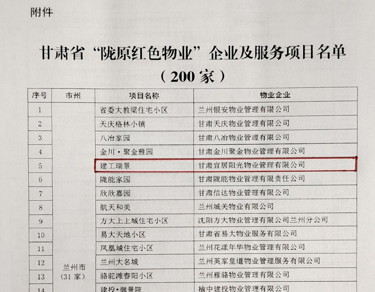 近日,甘肅省住房和城鄉(xiāng)建設(shè)廳隆重發(fā)布了《關(guān)于對(duì)全省200家“隴原紅色物業(yè)”企業(yè)及服務(wù)項(xiàng)目命名的通知》,以打造“黨建引領(lǐng)紅色物業(yè)”品牌、形成行業(yè)標(biāo)桿,以點(diǎn)帶面促進(jìn)全省物業(yè)服務(wù)高質(zhì)量發(fā)展等作為評(píng)選要求,按照“普中選好、好中選優(yōu)”的原則,經(jīng)過(guò)層層篩選,甘肅宜居陽(yáng)光物業(yè)公司“建工瑞景、上尚宅”2個(gè)小區(qū)榜上有名,甘肅宜居陽(yáng)光物業(yè)公司成功獲評(píng)甘肅省“隴原紅色物業(yè)”企業(yè),宜居陽(yáng)光物業(yè)所屬“建工瑞景、上尚宅”2個(gè)小區(qū)成功獲評(píng)甘肅省“隴原紅色物業(yè)”服務(wù)項(xiàng)目 。