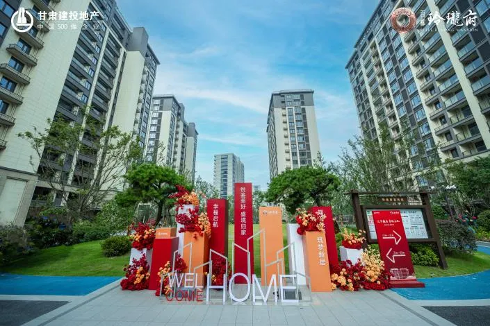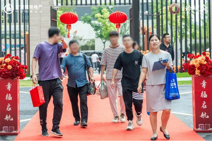 經(jīng)過盛裝布置,園區(qū)沿途一路鋪裝紅毯,枝頭掛滿紅燈籠,單元門口點綴燦爛花束,隨處可見“歡迎回家”的標語,“回家”的暖流直抵人心。