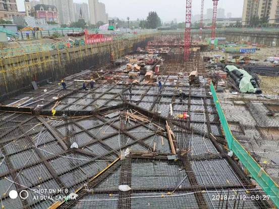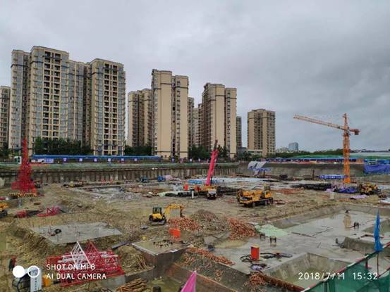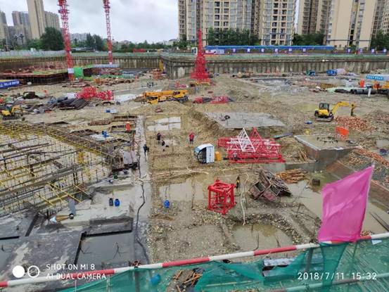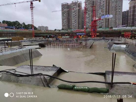 2018年7月,成都遭遇57年來最大降雨,多地出現(xiàn)暴雨橙色預(yù)警,四川省啟動II級防汛應(yīng)急響應(yīng)。為切實做好防暴雨安全措施,嚴(yán)防工地洪澇事故發(fā)生,百酈錦城的青年們組織各方,齊心協(xié)力、緊密協(xié)作,積極開展防汛抗災(zāi)工作。迅速成立防汛工作領(lǐng)導(dǎo)小組,提前安排部署,啟動防汛搶險應(yīng)急預(yù)案。各單位負(fù)責(zé)人親赴防汛一線,實地巡查,及時了解汛情。在施工現(xiàn)場張貼防汛標(biāo)語、設(shè)置警戒線,加強防汛沙袋、水泵、汽油等防汛物資的儲備,打好防汛前戰(zhàn)。實行24小時值班制度,專人守護(hù)、實時監(jiān)控,密切監(jiān)視汛情,加強汛情信息分析預(yù)測、預(yù)報、預(yù)警,加大對基坑四周的巡查力度,密切關(guān)注基坑沉降情況,針對基坑積水、土釘墻漏水等問題,使用挖機挖掘溝道、集水坑,利用水泵抽水至市政管道排走,保障基坑周邊的降水井正常降水。此外,為防止市政停電,現(xiàn)場配備柴油發(fā)電機,保證在停電后一個小時內(nèi),迅速恢復(fù)降水。同時加強臨電管控,有雨時除降水井用電外,其余配電箱全部停電。停雨后,分級檢查各設(shè)備情況,確認(rèn)無隱患后,逐級送電。合理分配救災(zāi)力量,搶險救災(zāi)有條不紊進(jìn)行,確保百酈錦城項目安然無恙。