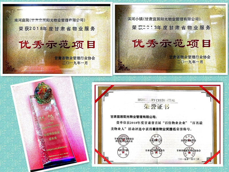 1月12日, 在甘肅省首屆“百家物業(yè)企業(yè)”、“百名最美物業(yè)人”評(píng)選活動(dòng)頒獎(jiǎng)晚會(huì)中,置業(yè)公司旗下的宜居陽光物業(yè)管理有限公司榮獲“最佳物業(yè)企業(yè)提名獎(jiǎng)”,南河庭院項(xiàng)目主任金蘭榮獲甘肅物業(yè)行業(yè)貢獻(xiàn)獎(jiǎng)。同日在首屆甘肅省省優(yōu)示范項(xiàng)目評(píng)定中由宜居陽光物業(yè)管理的南河庭院物業(yè)項(xiàng)目、濱河小鎮(zhèn)物業(yè)項(xiàng)目均獲得“甘肅省物業(yè)服務(wù)優(yōu)秀示范項(xiàng)目”的榮譽(yù)稱號(hào)。