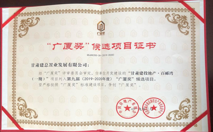 4月11日,在中國房地產(chǎn)協(xié)會各地房協(xié)會長、秘書長工作會議上,“甘肅建投地產(chǎn)•百酈灣(一期)”項目入選第九屆(2019—2020年度)“廣廈獎”候選項目。